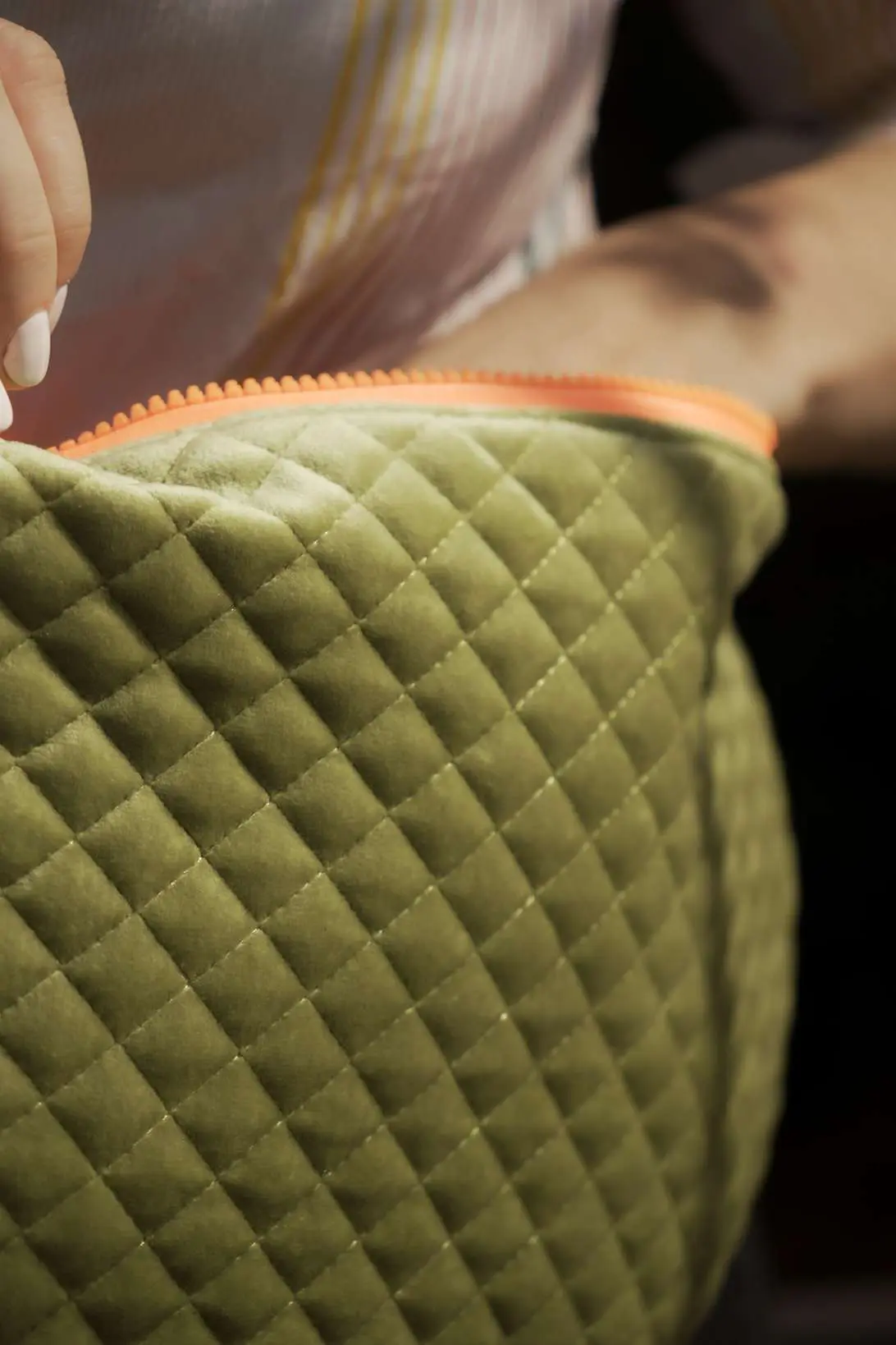 Spacious quilted shoulder bag with adjustable strap in olive colour with waterproof fluorescent orange nylon interior.